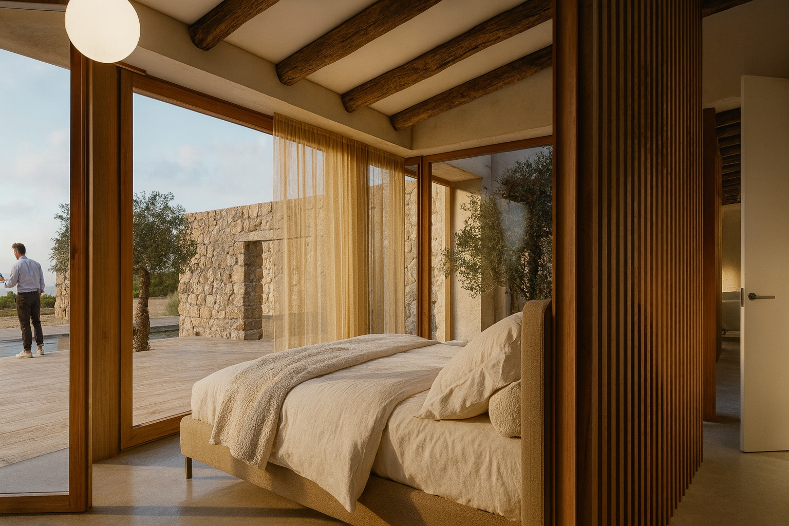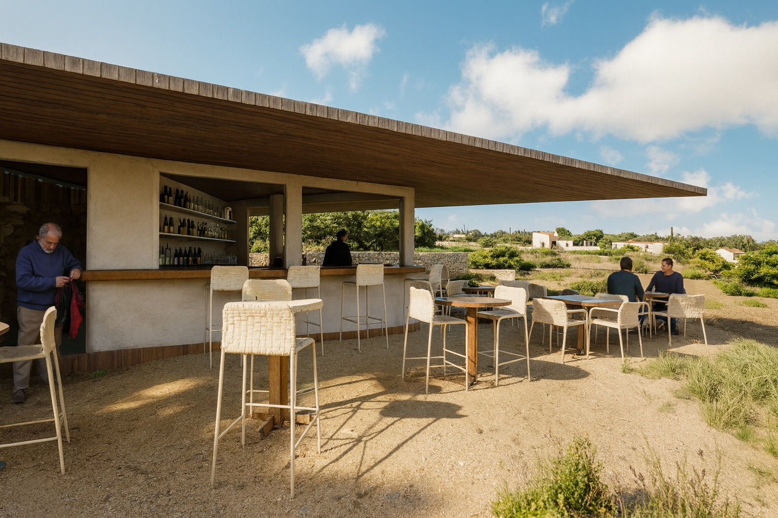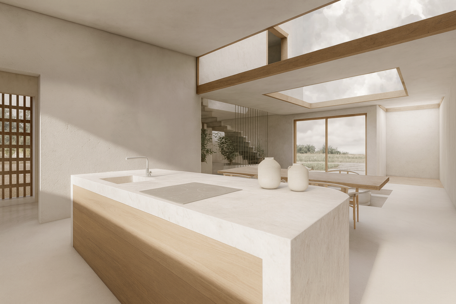 Los volúmenes blancos, las sombras y la textura de los materiales se relacionan con el lugar, reforzando la conexión entre la casa y su entorno.