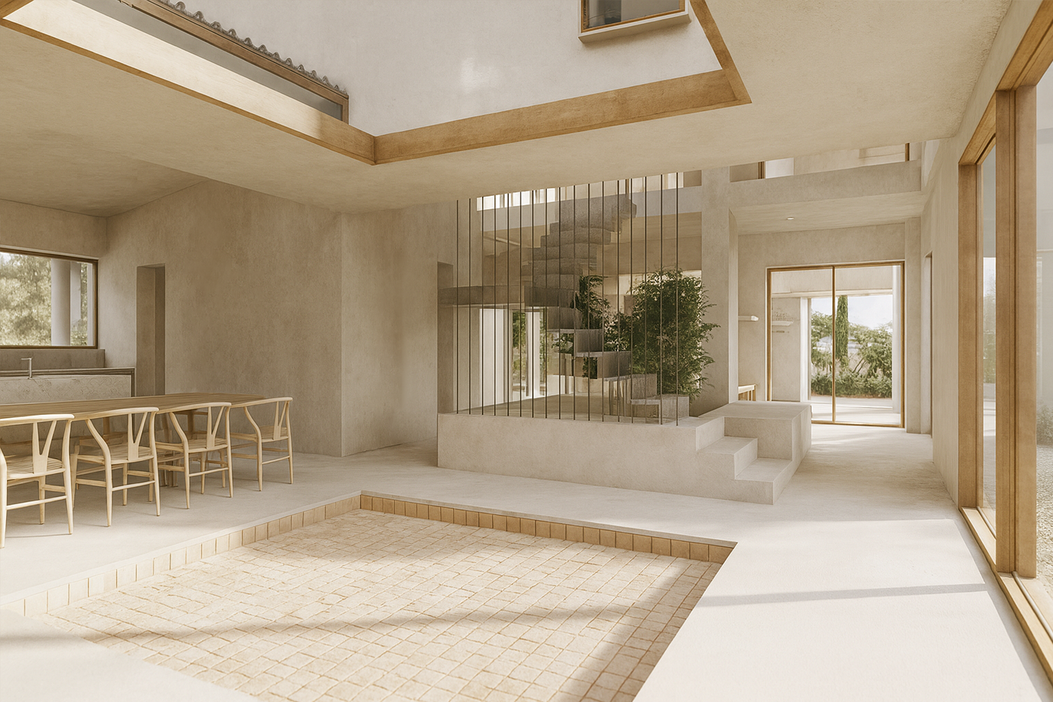 Con presencia de grandes ventanales, patios interiores y celosías, se logra de manera indirecta, que el contexto atraviese los espacios y brinde una sensación de estar inmerso en éste.