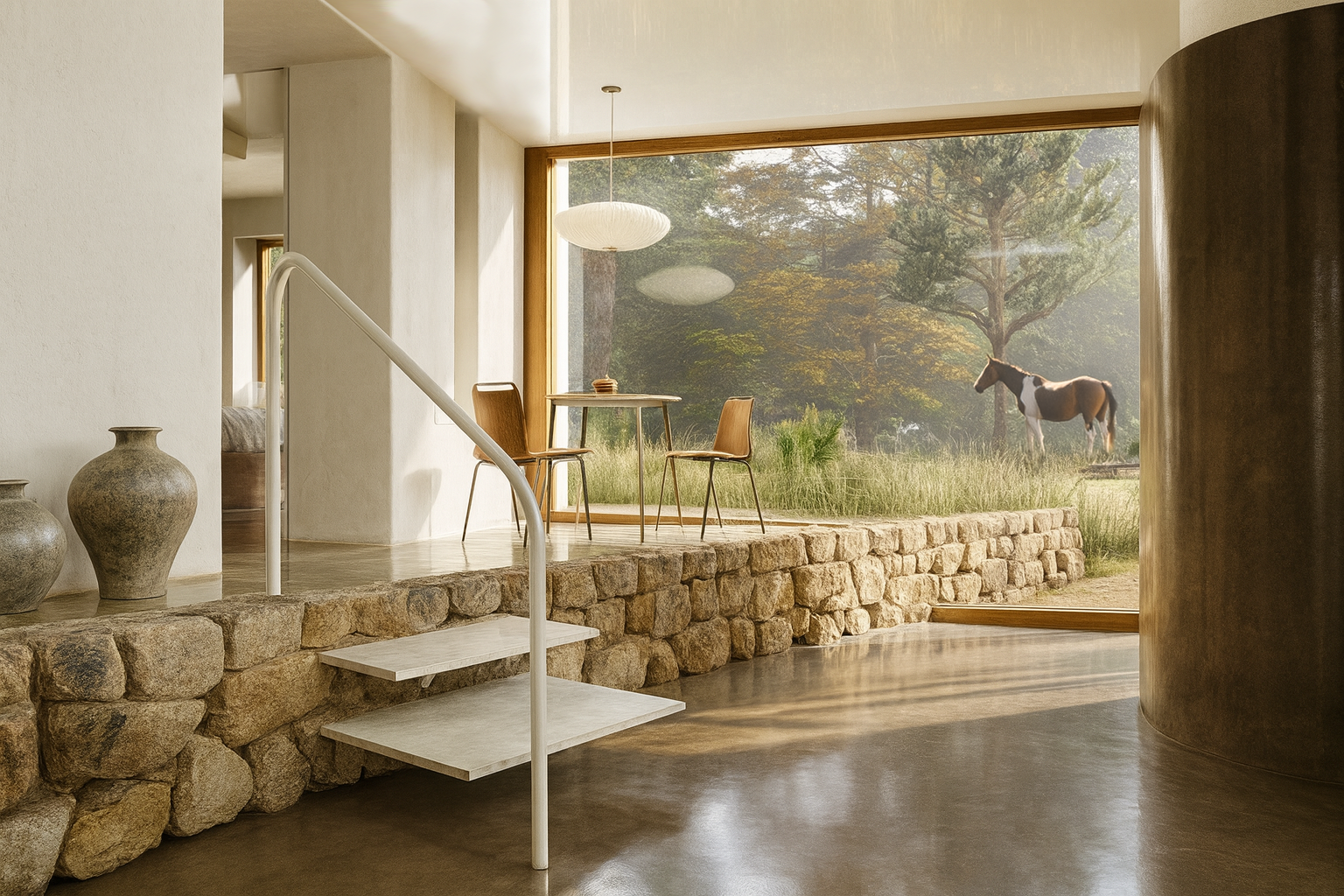 Los muros de cal y la madera mantienen el carácter de la construcción existente, mientras que la amplitud y la pureza de las líneas introducen una mirada contemporánea.