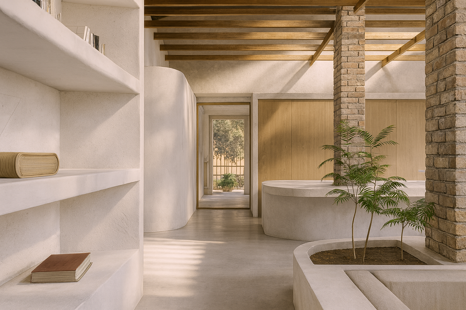 Se mantienen elementos ya existentes como la bóveda y pórticos, mismos que conforman un juego de relaciones entre interior y exterior y, que al mismo tiempo logran generar una atmósfera de contemplación y relajación.