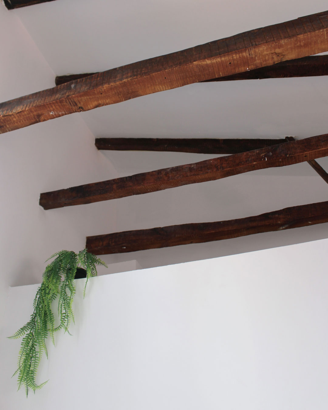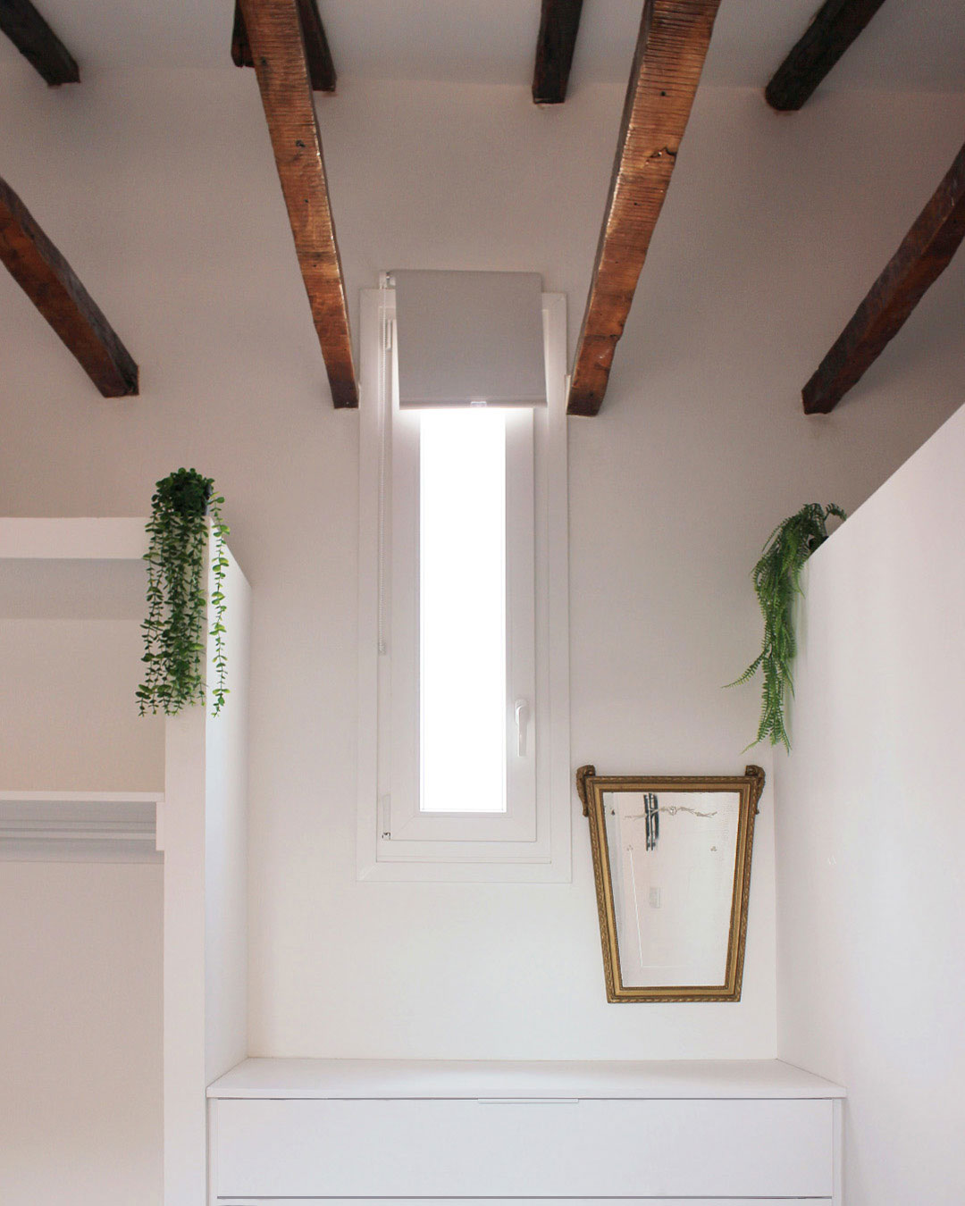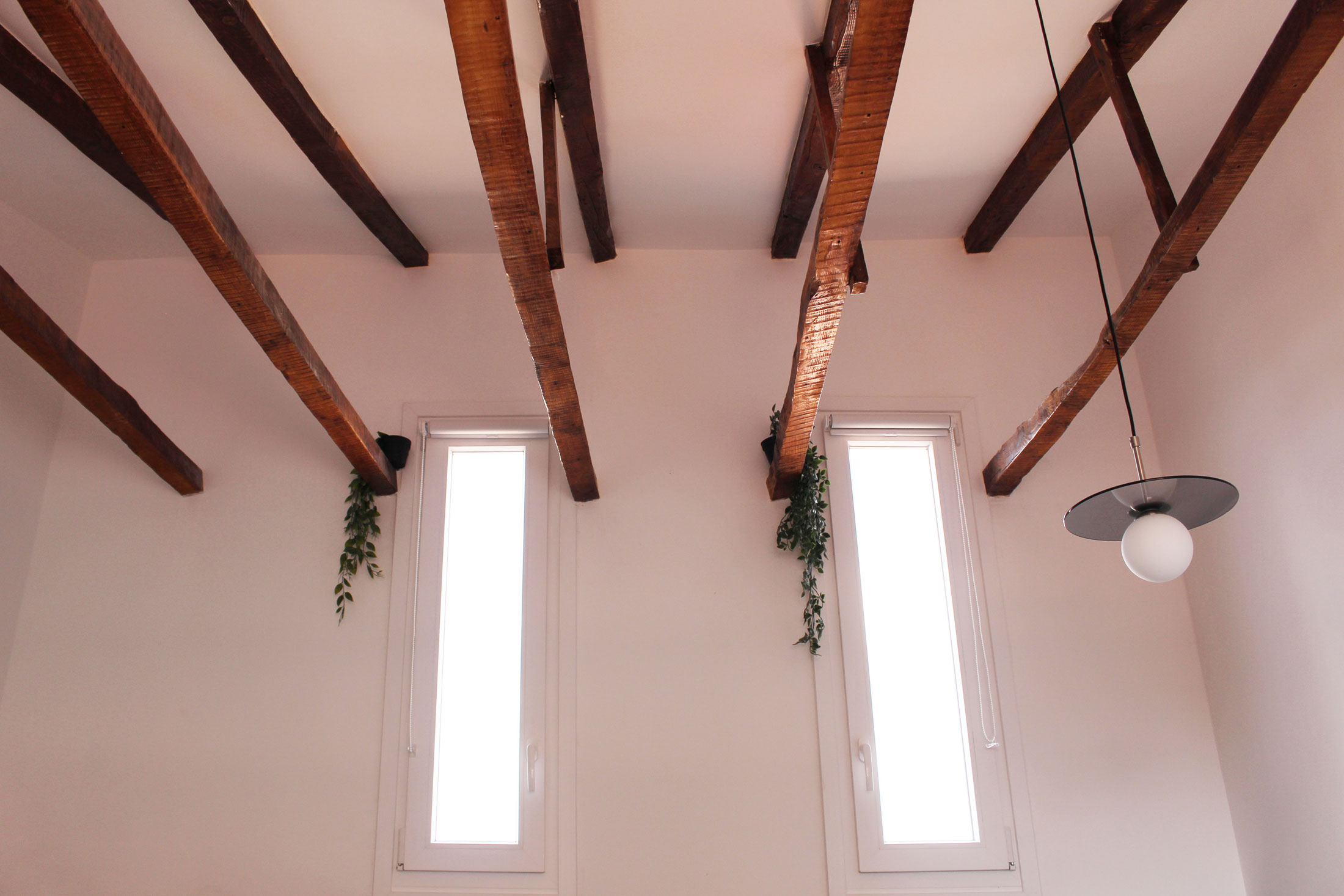 El punto de partida fue una planta reducida, un ático donde cada metro contaba, pero también cada hueco de luz, cada gesto estructural preexistente. La primera decisión proyectual fue tan respetuosa como decidida: liberar las vigas de madera que atravesaban el techo y devolverlas a su estado visible. Estas vigas, antes ocultas, se convirtieron en las protagonistas silenciosas del espacio.