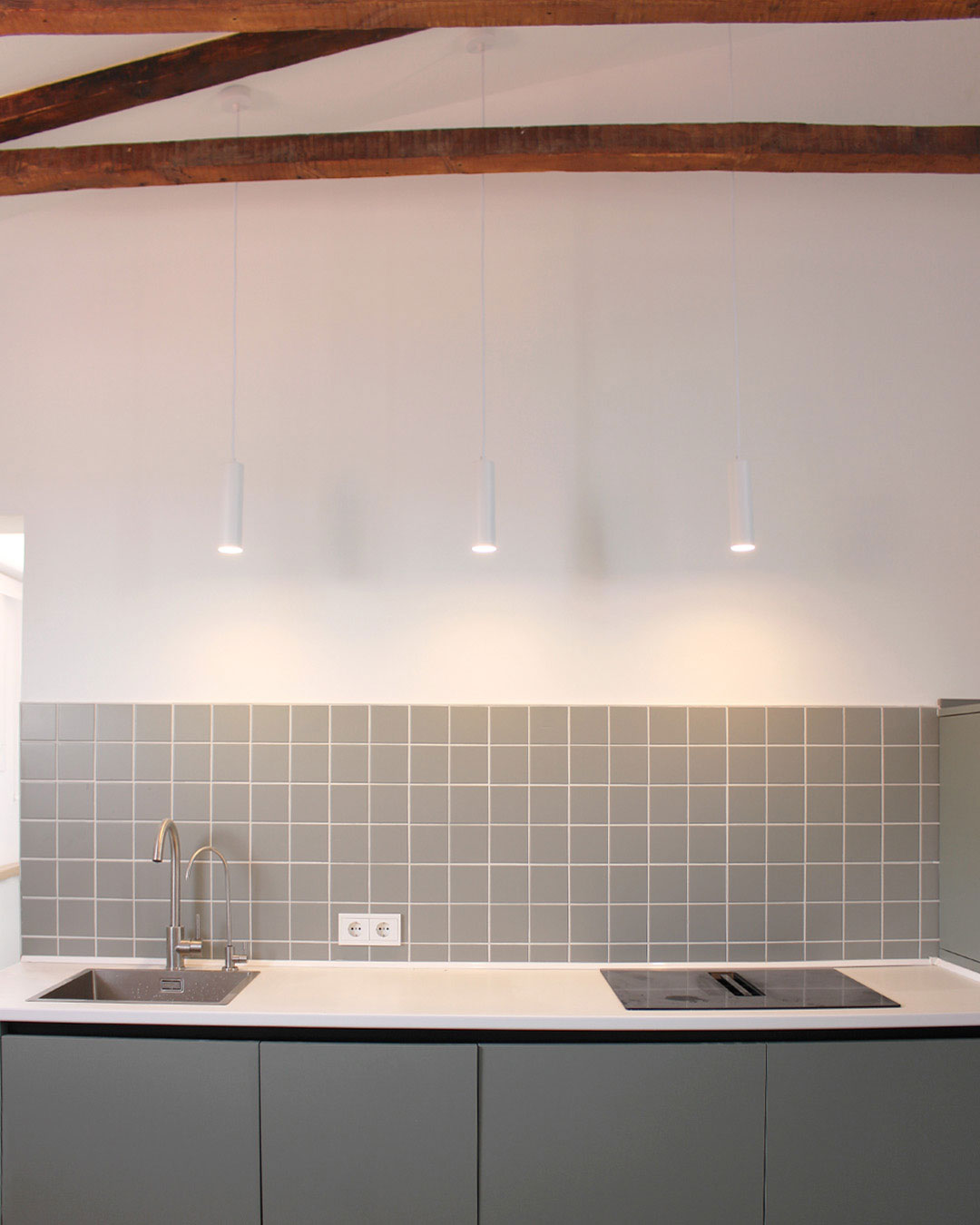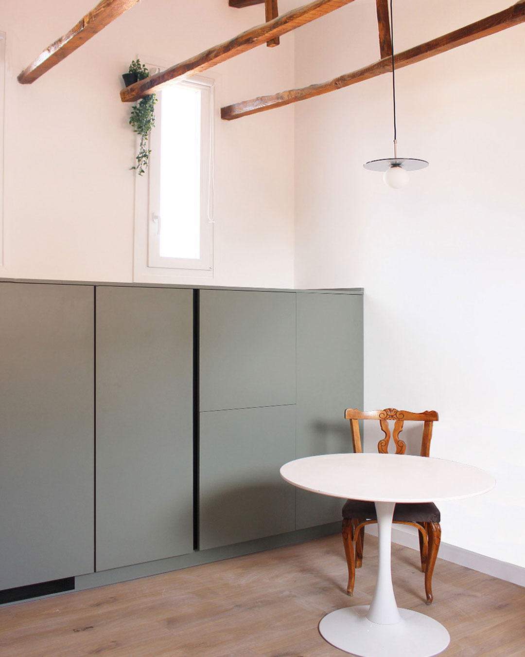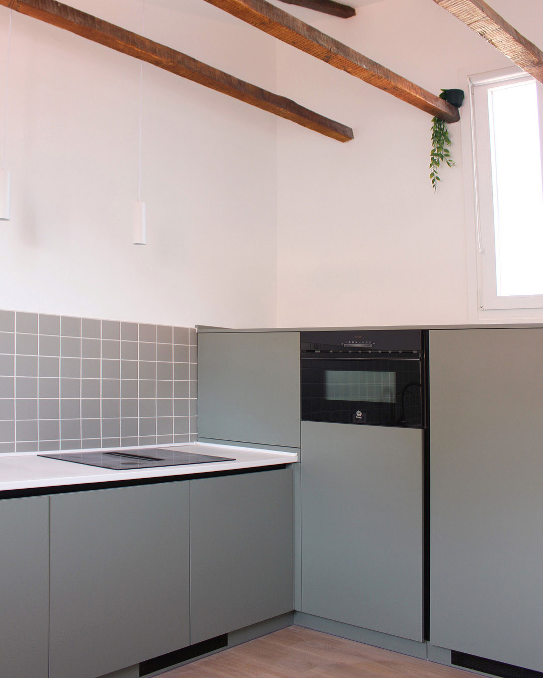La zona de día es un ejemplo de cómo la claridad espacial puede alcanzarse con decisiones precisas. La cocina se despliega en dos frentes: uno más bajo, abierto y funcional, y otro más alto, que resuelve las necesidades de almacenaje sin interrumpir la ligereza visual. Los tonos elegidos —blanco, verde pastel cálido y una baldosa que actúa como piel sutil en el frente— acentúan esta sensación de ligereza, acompañada por la verticalidad de dos luminarias que subrayan el plano de trabajo.