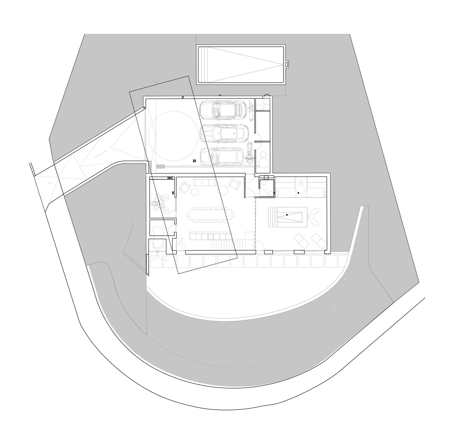 El nivel inferior se abre mediante un patio inglés que aporta luminosidad y ventilación a los espacios semienterrados. Este patio actúa como un pequeño jardín interior, un espacio donde la naturaleza penetra en la vivienda y donde se cultiva, de forma literal y simbólica, el equilibrio entre cuerpo y mente. Es un ejemplo de cómo la arquitectura puede conectar interior y exterior con un gesto sencillo y eficaz.