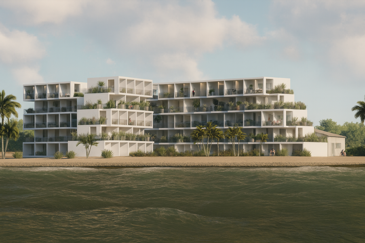 Así mismo, existe un retranqueo del edificio, generando terrazas escalonadas en cada nivel y, adaptándose de manera natural a la topografía y al entorno costero.