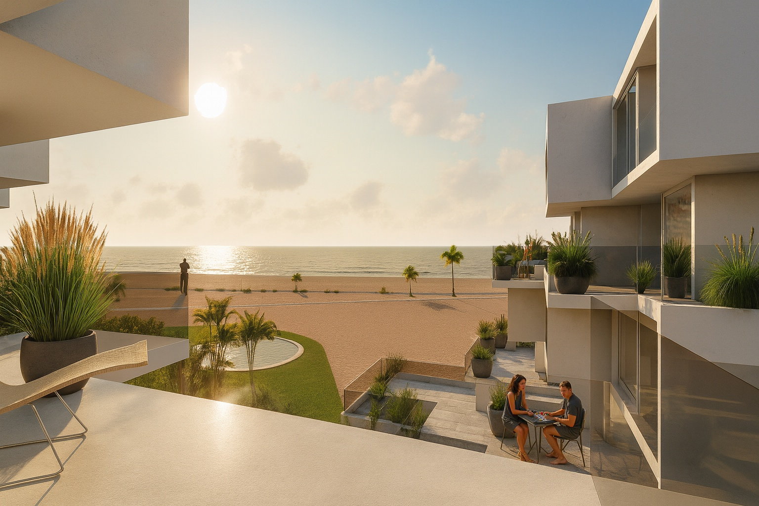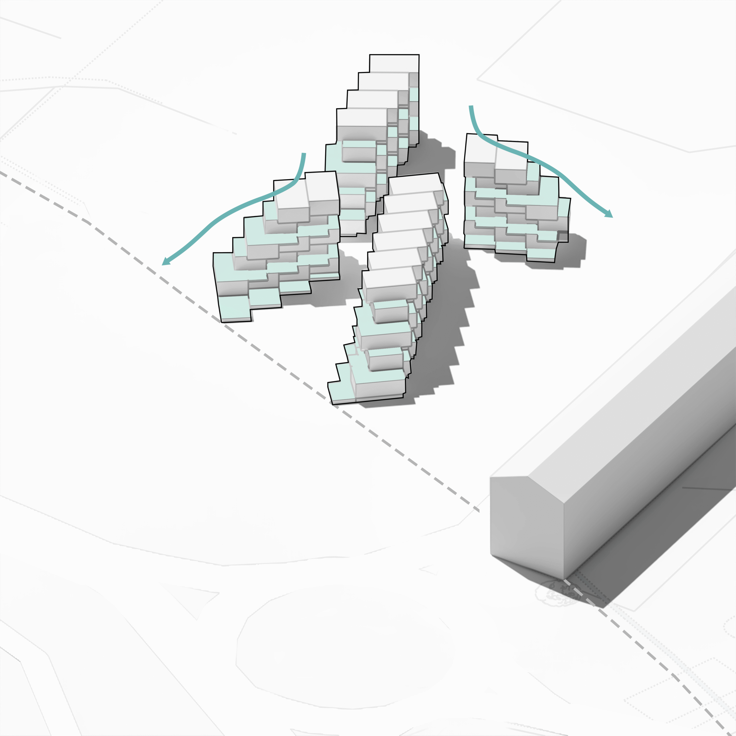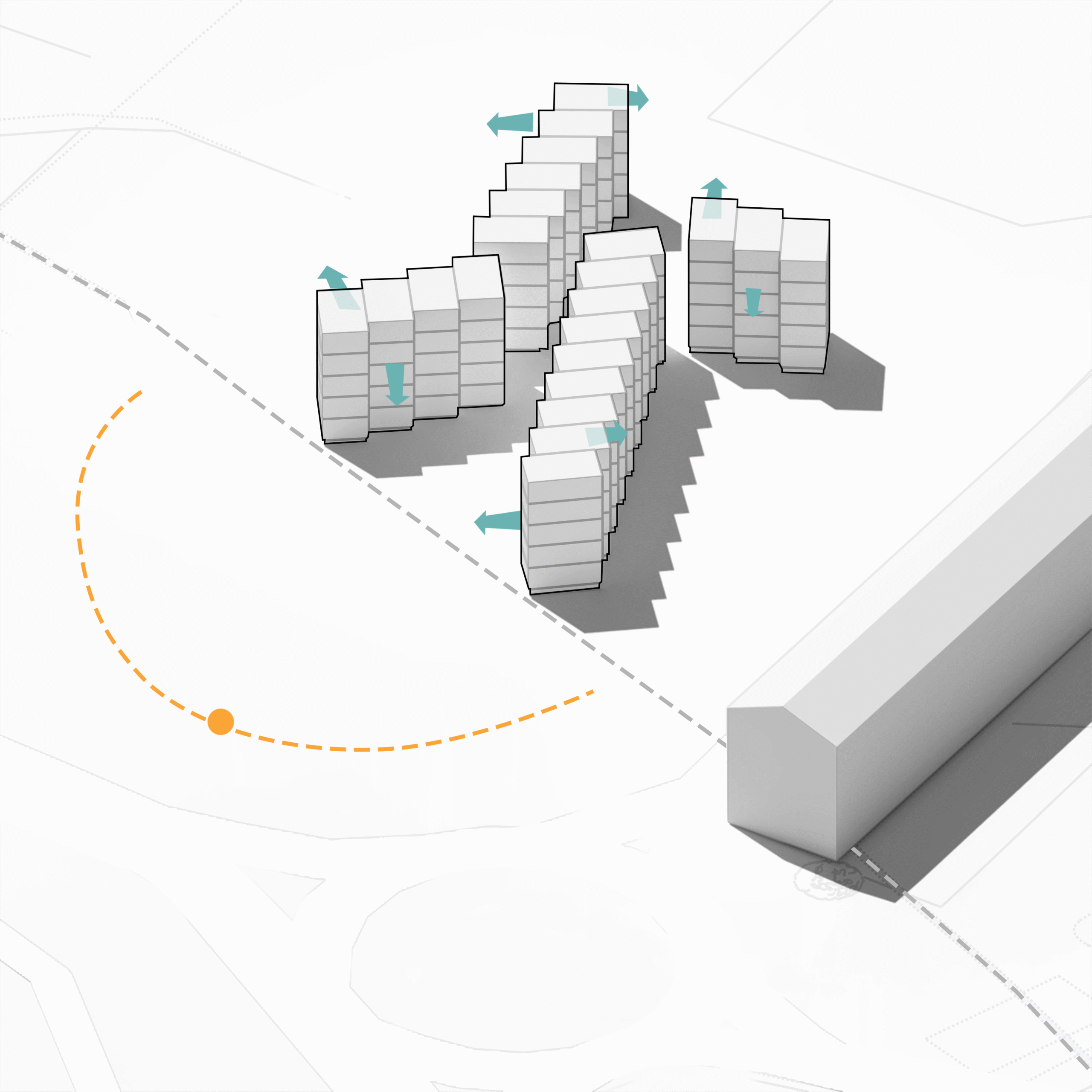 Esta disposición busca optimizar la entrada de luz solar en todas las viviendas, y, con esta estrategia, se permite también enriquecer las visuales, ofreciendo panorámicas amplias hacia el mar.