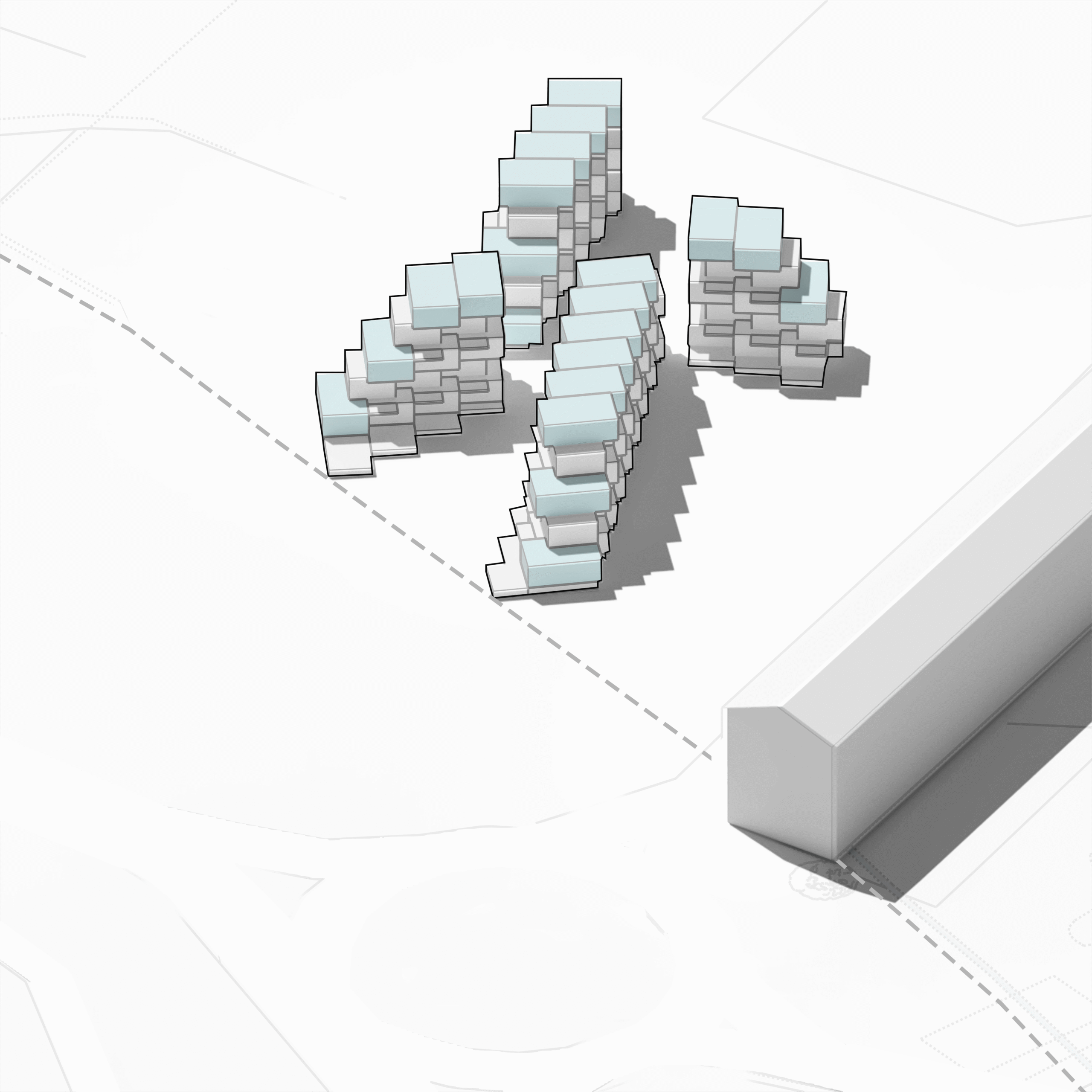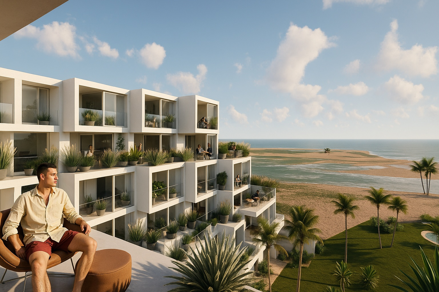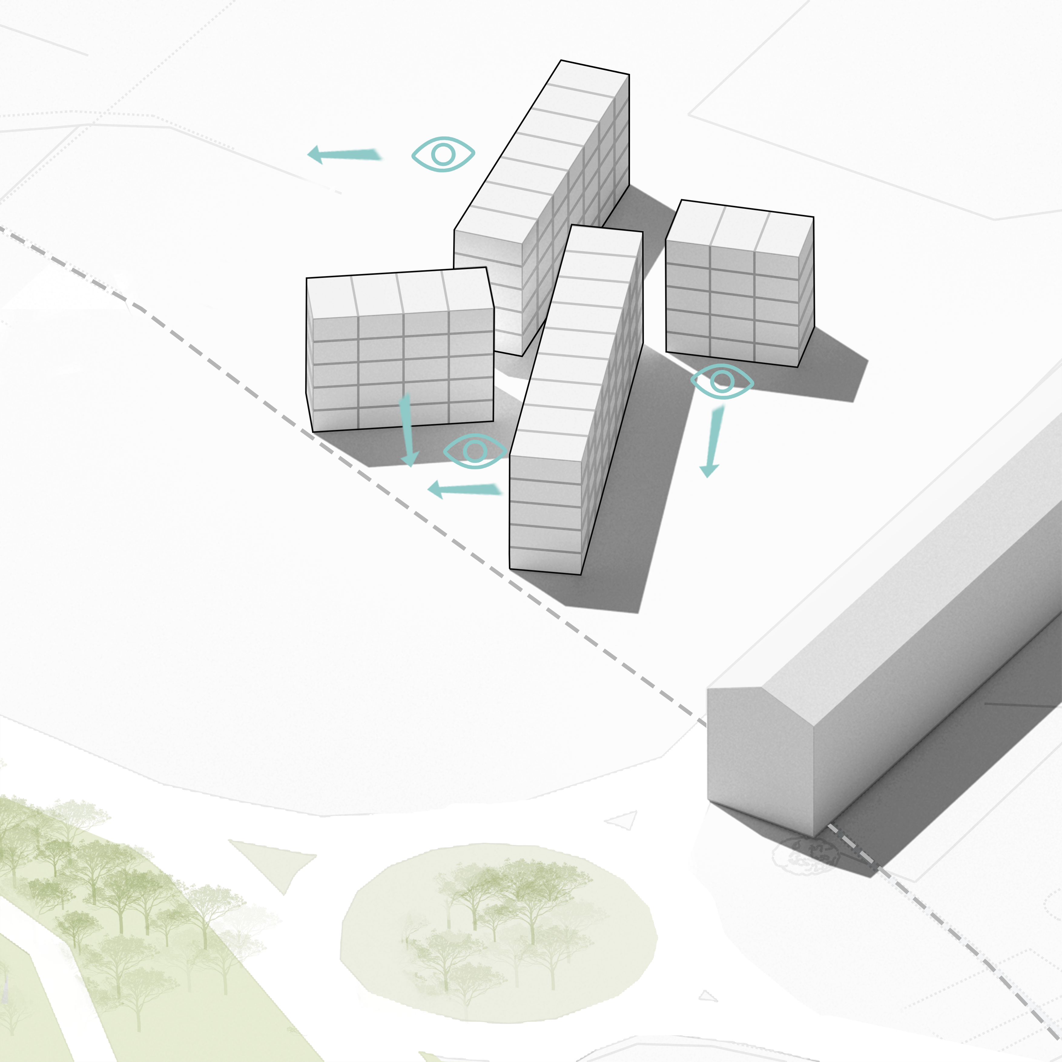 Esta disposición busca optimizar la entrada de luz solar en todas las viviendas, y, con esta estrategia, se permite también enriquecer las visuales, ofreciendo panorámicas amplias hacia el mar.