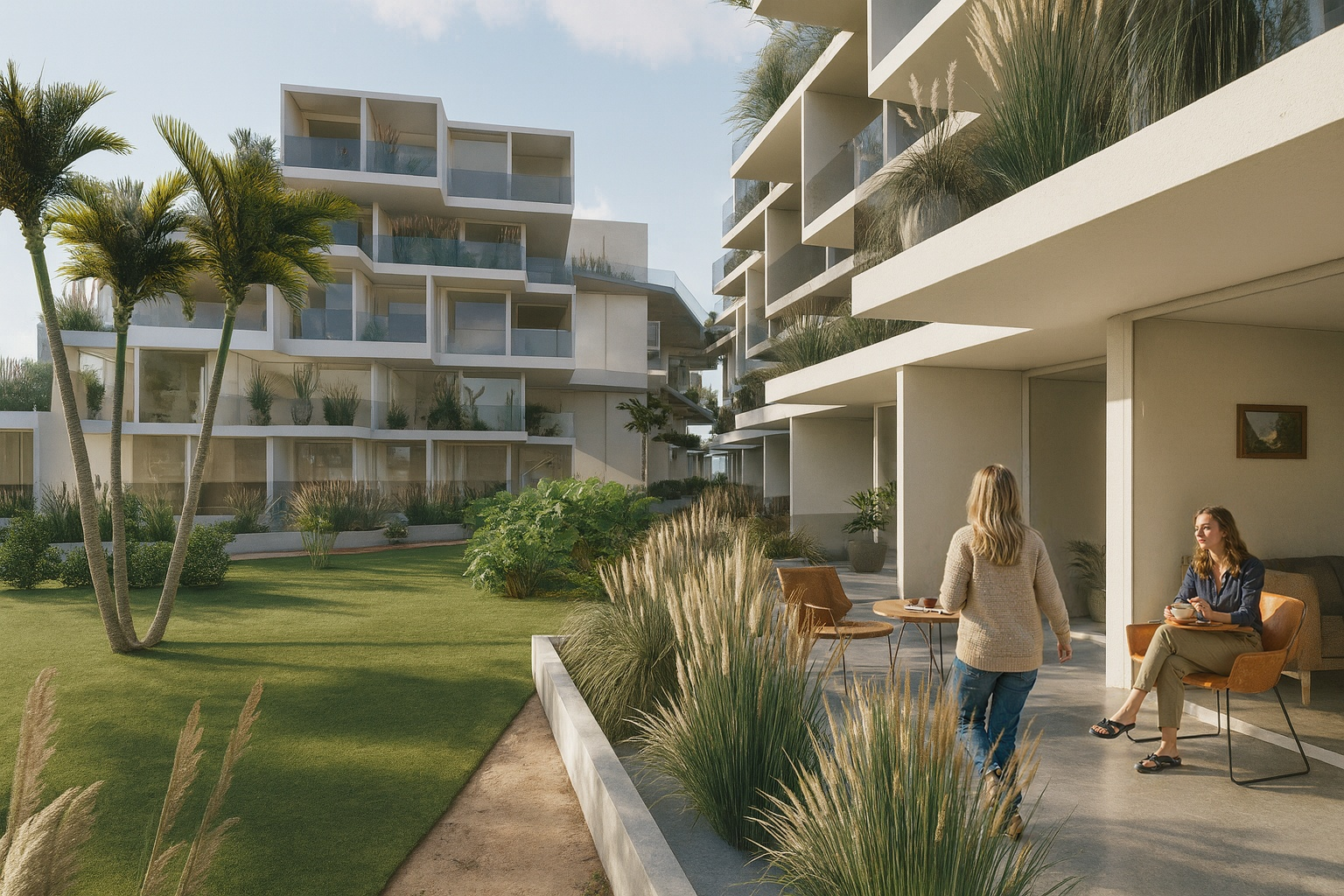 El diseño de este conjunto se organiza en cuatro bloques alargados, que, favorecen la generación de doble orientación, logrando así una ventilación cruzada natural, ideal para el clima costero.